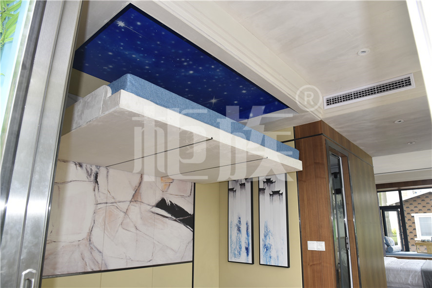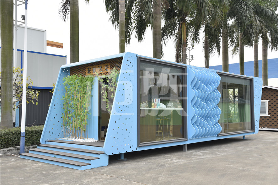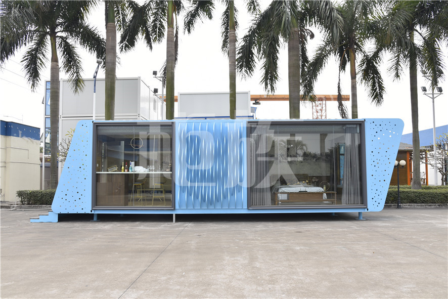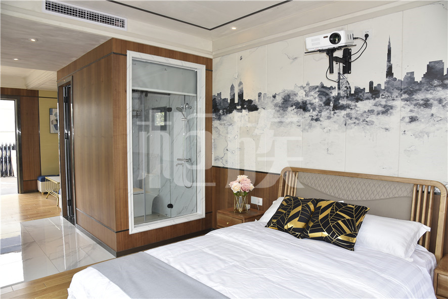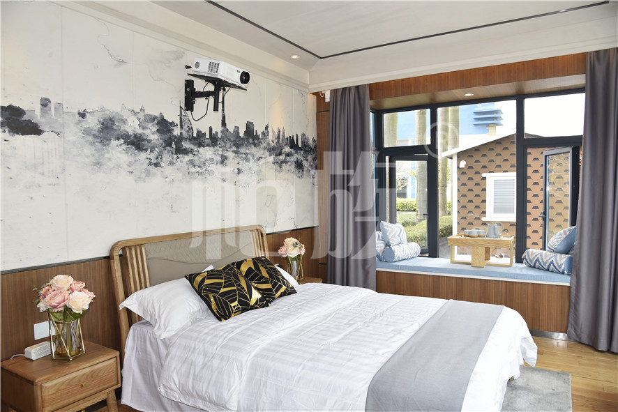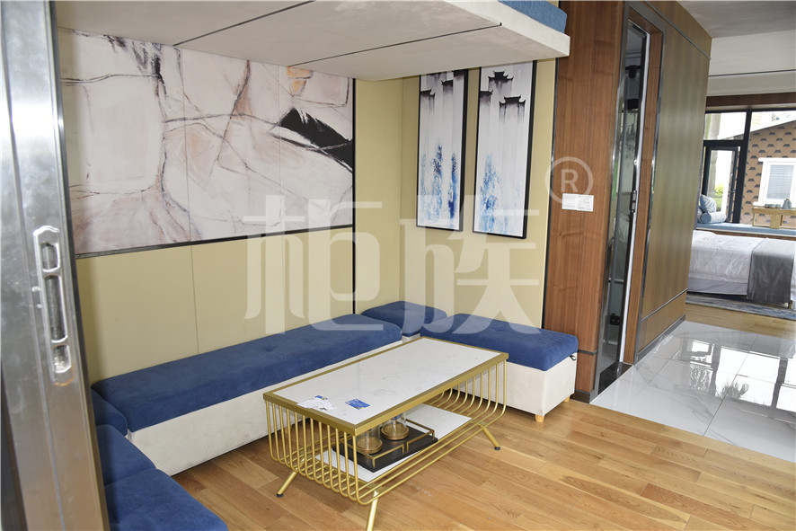功能布局:入戶臺階,箱子整體抬高,前廳設吧臺和茶幾,樓面為隱藏式升降床,中部為衣柜、洗手臺及衛(wèi)生間,臥室內帶飄窗陽臺,配影音系統(tǒng)。大面積落地玻璃窗,適合觀景。設計用途為景區(qū)特色民宿。