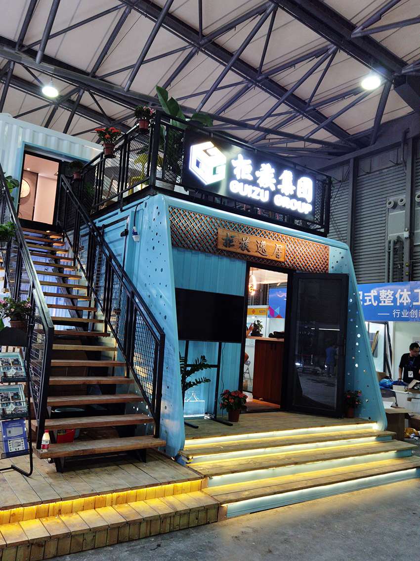 柜族本次參展的產(chǎn)品——逸海小筑位于E2裝配式建筑展區(qū)的2269展位,是一款以藍(lán)白為主色調(diào)、融入了水與波浪元素的海洋風(fēng)集裝箱別墅。該產(chǎn)品的設(shè)計(jì)理念為環(huán)保、舒適、旅居,以不破壞場(chǎng)地與自然環(huán)境為出發(fā)點(diǎn),整個(gè)產(chǎn)品為工廠預(yù)制完成,地面抬高3個(gè)臺(tái)階,有效隔離了地面的潮氣。箱子著力點(diǎn)有圓柱支撐,底座圓盤加大了受力面積和整體平衡性。箱子整體分為一、二層兩個(gè)模塊,用吊機(jī)和平板車整體裝卸運(yùn)輸,在選好的平整地面直接擺放就可以入住使用了。